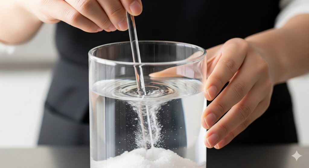 - 塩を完全に溶かす: 計量した塩を水に入れ、プラ棒などでよくかき混ぜて完全に溶かしきります。底に塩の粒が残っている状態でメダカを入れると、その部分だけ極端に濃度が高くなり、エラや皮膚にダメージを与えてしまう危険があります。水が透明になるまで、根気よくしっかりと溶かしましょう。