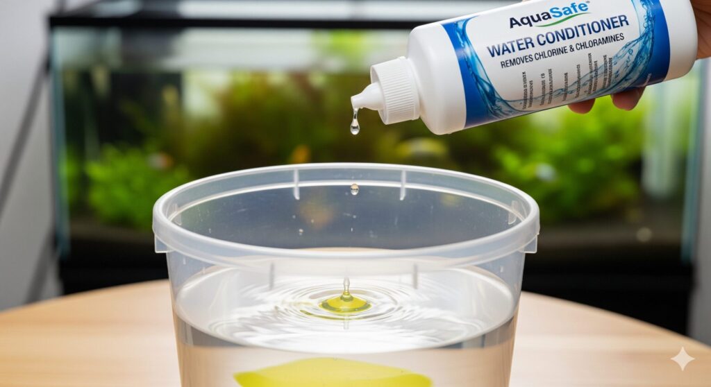 - カルキ抜きした水を入れる: 必要な量の水を容器に入れます。この水は、市販のカルキ抜き剤(水質調整剤)を使って必ず塩素を中和するか、最低でも一晩以上汲み置きして塩素を抜いたものを使用してください。